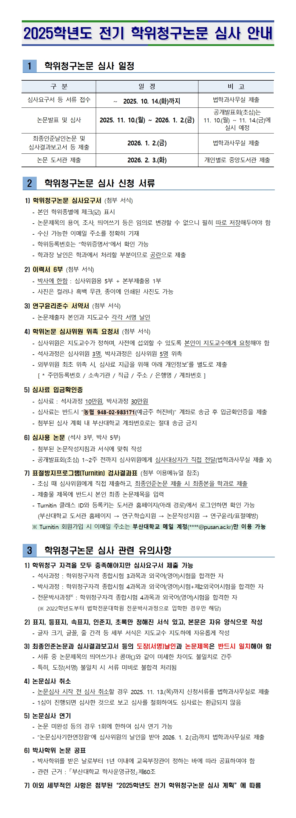 fnctId=bbs,fnctNo=3855 작성일 2025.09.18 수정일 2025.09.18 작성자 법학과 조회수 190 2025학년도 전기 학위청구논문 심사 계획 알림(~10/14,화) 첨부파일 1. 제출서류 서식.hwp 미리보기 2. 논문작성가이드 및 지침.zip 3. 표절방지프로그램 매뉴얼.pdf 미리보기 4. 학위청구논문 심사요구 취소 및 심사료 환불 신청서(서식).hwp 미리보기 5. 2025학년도 전기(2025학년도 2학기) 학위청구논문 심사 계획_학생용.hwp 미리보기